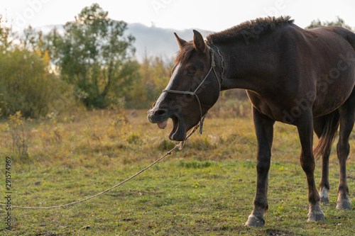 © Дмитрий Ногаев, Fototapeta premium Horse laughing while standing in a meadow