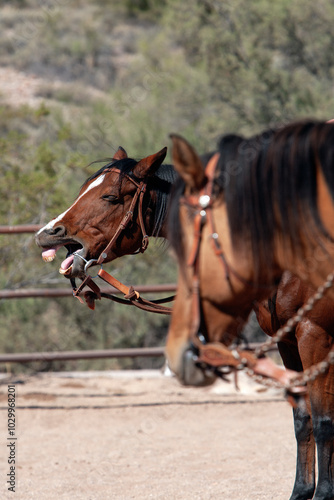 © Cavan, Fototapeta premium Horse neighing in dirt ring with another horse nearby