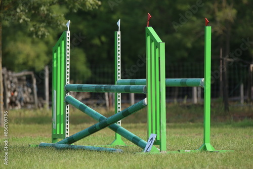 © acceptfoto, Fototapeta premium Horse obstacle course outdoors summertime. Poles in the sand for equestrian event