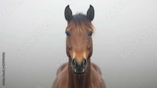 Obraz premium Horse portrait in misty landscape; tranquil moment; nature scene; wildlife photography; use in nature-themed publications or websites