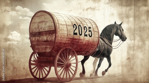 © Oleksandra, Fototapeta premium Horse pulling a large wooden barrel with the year 2025 displayed, symbolizing progress and future in vintage style art