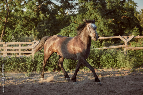 Fototapeta premium Horse running in the paddock on the sand in summer
