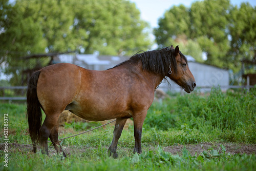 © Yurii Zushchyk, Obraz premium Horse standing grazing in the pen for horses, stable of a rural farm on a background. Mena, Ukraine