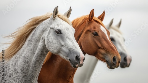 © sa-photo, Fototapeta premium Horse standing with mane flowing on white background