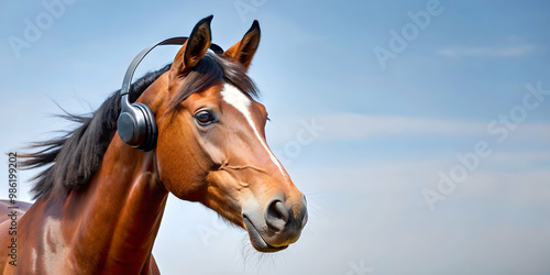 Obraz premium Horse wearing headphones, looking relaxed and entertained while enjoying...