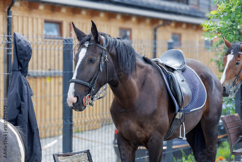 © Jorens, Fototapeta premium Horse with a saddle on a rural background