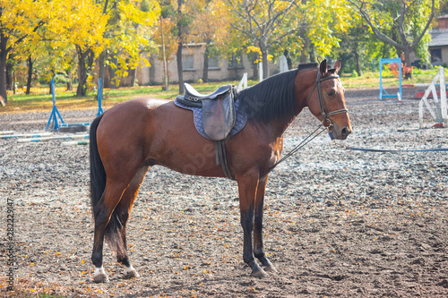 Obraz premium Horse with a saddle on the racetrack during training. Animals