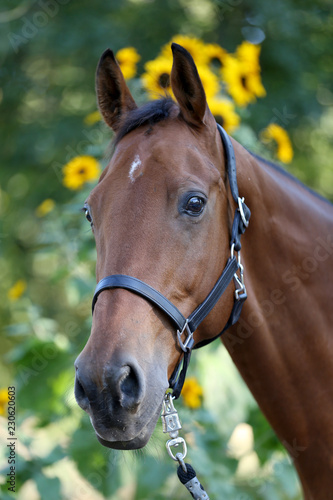 Fototapeta premium Horse with sunflowers in the background
