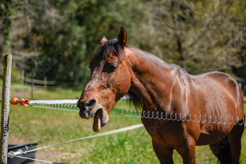© Andrew, Fototapeta premium Horse with tongue out mid yawning in Sintra, Portugal