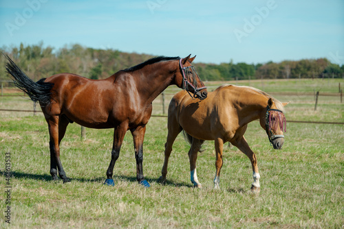 © EwaStudio, Fototapeta premium Horses at horse farm. Country summer landscape