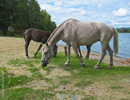 Obraz premium Horses eating grass in a green meadow. Cute domestic animals grazing on a...