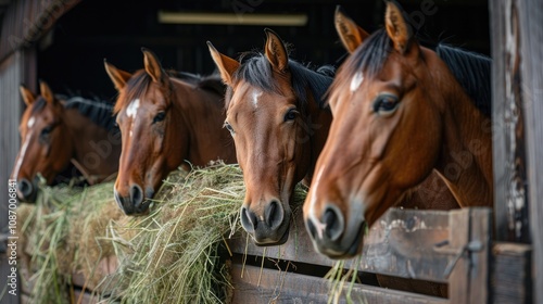 Obraz premium Horses eating hay in a stable. This image is perfect for illustrating articles about horses, stables, or animal care.