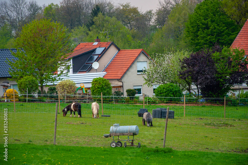 © MuamerO, Obraz premium Horses gaze the grass in the small courtyard