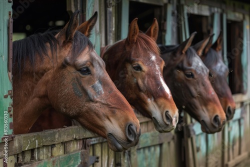 © Fitry, Fototapeta premium Horses gazing out from their stalls at the sight of approaching visitors, displaying curiosity and interest