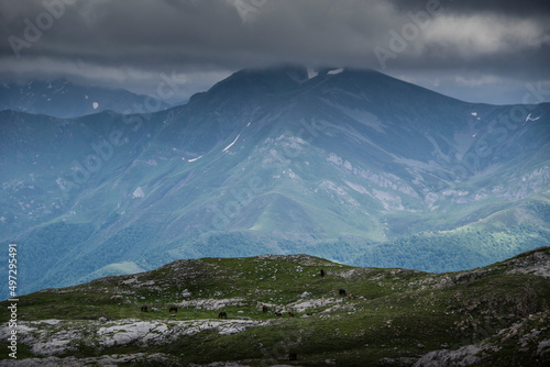 © Ana, Fototapeta premium Horses graze in a green meadow with big mountains in the background
