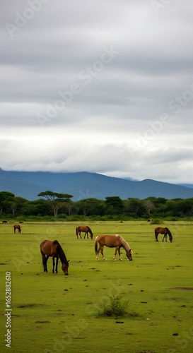 © Alex, Fototapeta premium Horses Grazing in a Meadow Landscape.