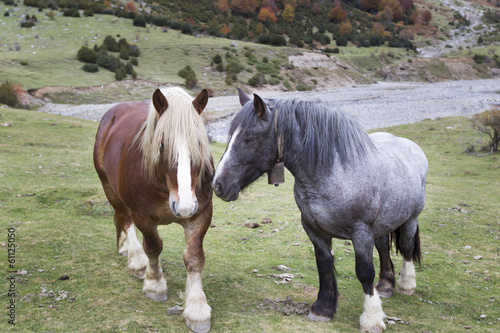 © bykofoto, Fototapeta premium horses grazing in a meadow surrounded by mountains