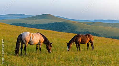 © Mahmudah, Obraz premium Horses Grazing in Rolling Hills