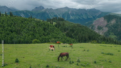Obraz premium Horses grazing in the mountains of Kyrgyzstan. Wild gorses grazing on the grass in the valley