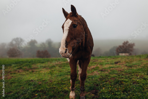 © UnPinky, Fototapeta premium Horses Grazing on a Farm Early in the Morning