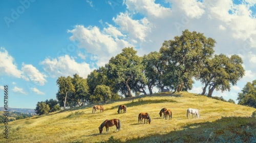 © Fenny, Obraz premium Horses grazing on a sunny hillside pasture under a blue sky.