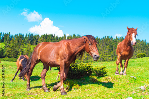 © Crisp, Fototapeta premium horses in a meadow in the mountains
