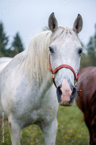 Obraz premium Horses in summer pasture on a rainy day in quebec canada