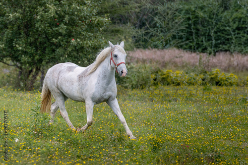 © Beatrice, Obraz premium Horses in summer pasture on a rainy day in quebec canada