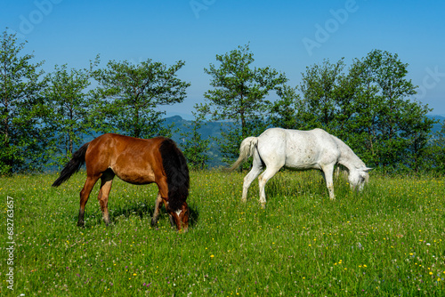 © Vitali, Fototapeta premium Horses on green meadow on Carpathians mountains landscapes, Apetska mountain, Ukraine