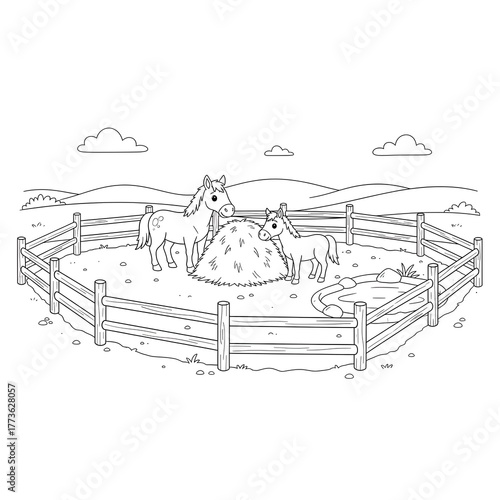 Fototapeta premium Horses paddock farm shows peaceful countryside landscape coloring page