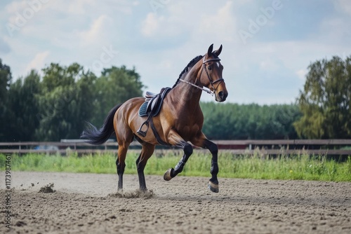 © Dream maker, Obraz premium Horses running freely in a lush green pasture during golden hour