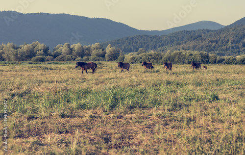 © anzebizjan, Fototapeta premium Horses running freely in evening light.