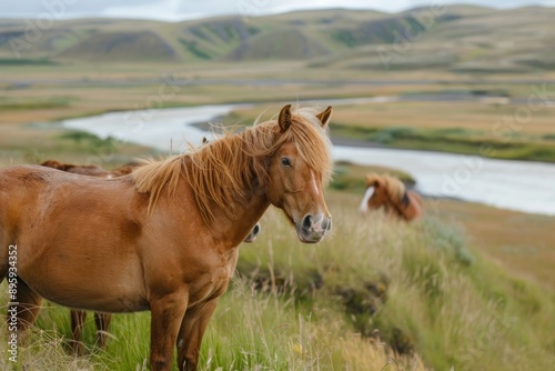 Fototapeta premium horses stand against a background of grassy hills and plains landscape