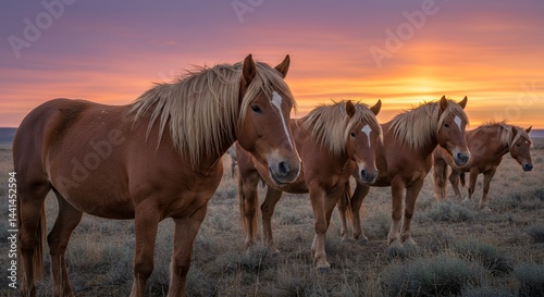 © Harfia, Fototapeta premium Horses Standing in Field at Sunset