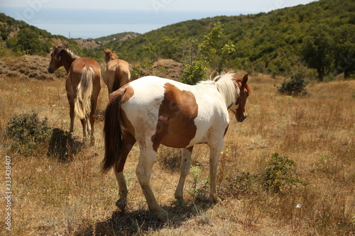Fototapeta premium Horses take a seat on the field in summer. Herd, pinto, foal.