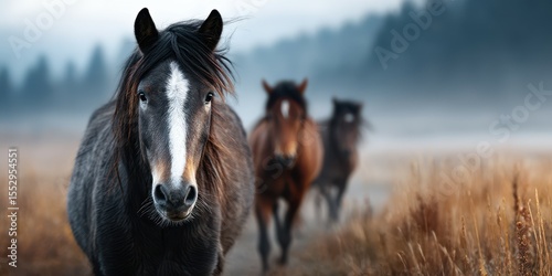 © Michael, Fototapeta premium Horses wander through a misty meadow at dawn, showcasing natural beauty and serene atmosphere in a calm landscape