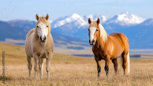 Fototapeta premium Horses wandering gracefully in a serene meadow under the mountains