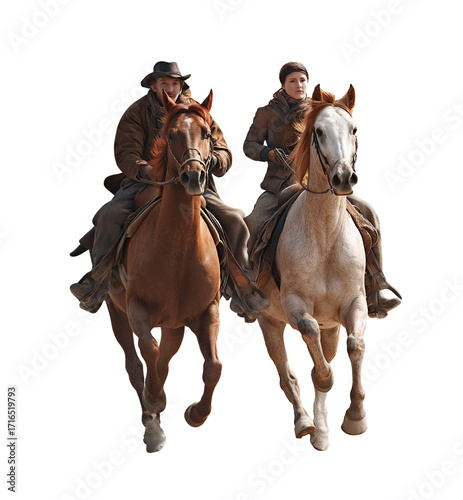 © Chadys, Obraz premium Horses with male and female riders isolated on White or transparent background Cutout PNG
