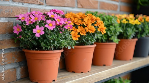 © Nitchalee N., Fototapeta premium horticulture botany and techniques, A vibrant display of potted flowers in shades of pink, orange, and green, arranged neatly on a wooden shelf against a brick wall.