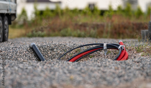 © Trygve, Naklejka premium Hoses and pipes sticking up from the ground at a building site.