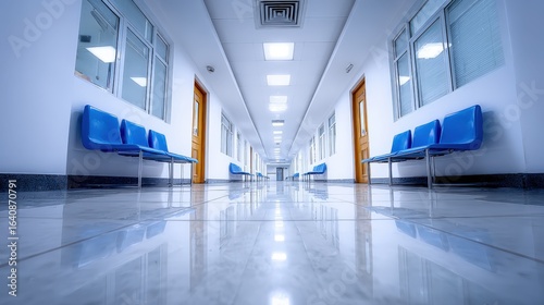 Obraz premium Hospital Hallway with Blue Seats: Interior Architecture and Empty Waiting Area for Patients