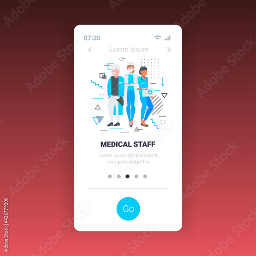 Naklejka premium hospital medical staff team doctors nurses surgeons in uniform medicine healthcare concept smartphone screen mobile app full length