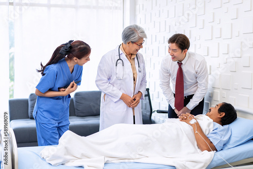 © Tongpool, Fototapeta premium Hospital treatment room relative visit patient lay on bed doctor explain update illness condition