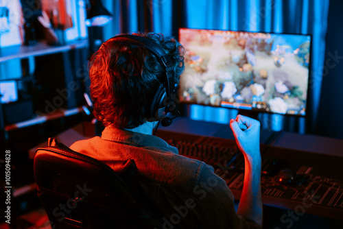 © InfiniteFlow, Obraz premium Host channel of young gaming streamer getting to win fighting Moba at battle arena with multiplays team, wearing headphone on pc monitor with back side image at neon digital light modern room. Gusher.