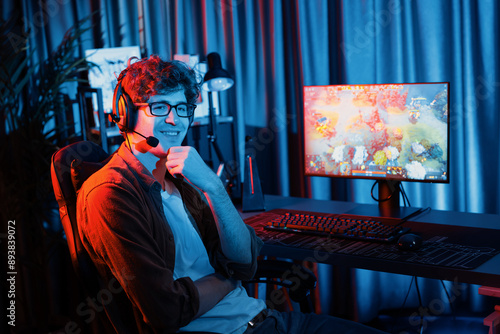 Fototapeta premium Host channel of young gaming streamer looking at camera to present fighting Moba battle arena game with multiplays team against on blurred pc screen background at neon digital lighting room. Gusher.
