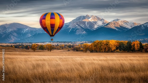 © Olga, Obraz premium Hot air balloon above dry grass field and mountains