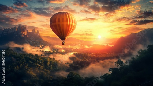 © Ramil, Obraz premium Hot air balloon above high mountain at sunset, filtered background