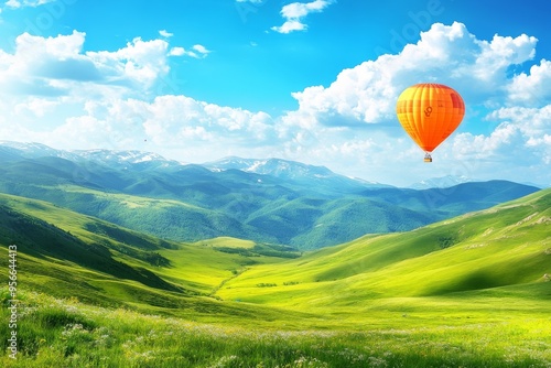 Obraz premium Hot Air Balloon Ascending Over Lush Green Mountains
