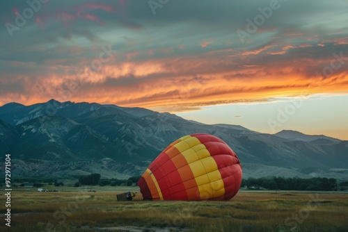 © AHNH2, Obraz premium Hot Air Balloon Deflated in Mountain Landscape at Sunset