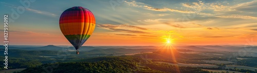 © Rossarin, Fototapeta premium Hot air balloon flies over the green fields and hills at sunrise